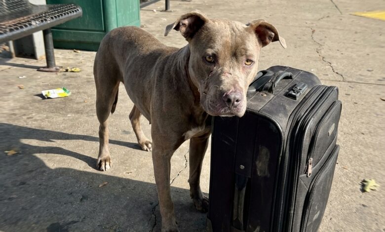 A starving stray dog stood guard over an abandoned suitcase at the bus station… no…