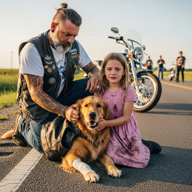 Jake “Iron” Matthews pulled his Harley to the side of the road. He’d been riding for hours, the rumble of the engine drowning out thoughts he didn’t want to face. But when he saw the girl kneeling beside a golden retriever in the ditch, everything stopped.