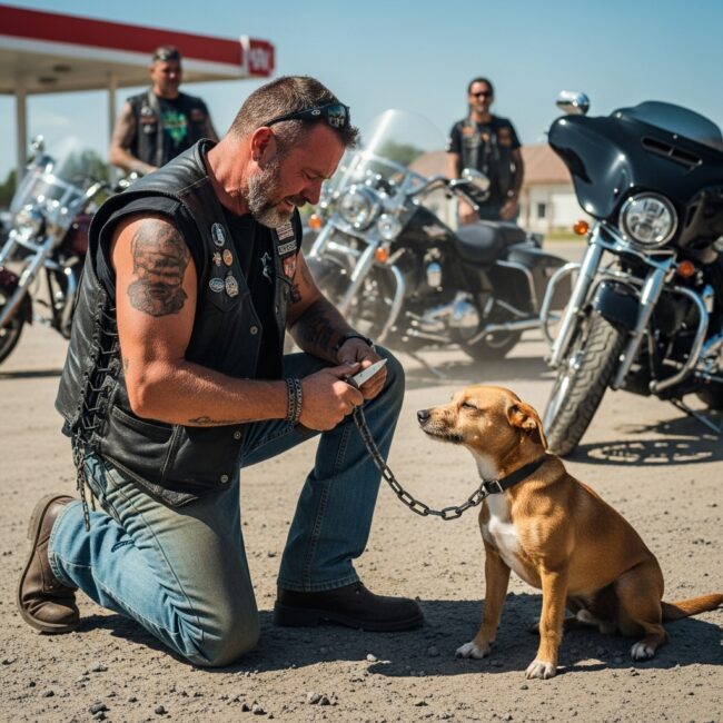 A Biker Held a Chain Around a Dog’s Neck — And When He Cut It Off, the Sound That Followed Silenced the Entire Street