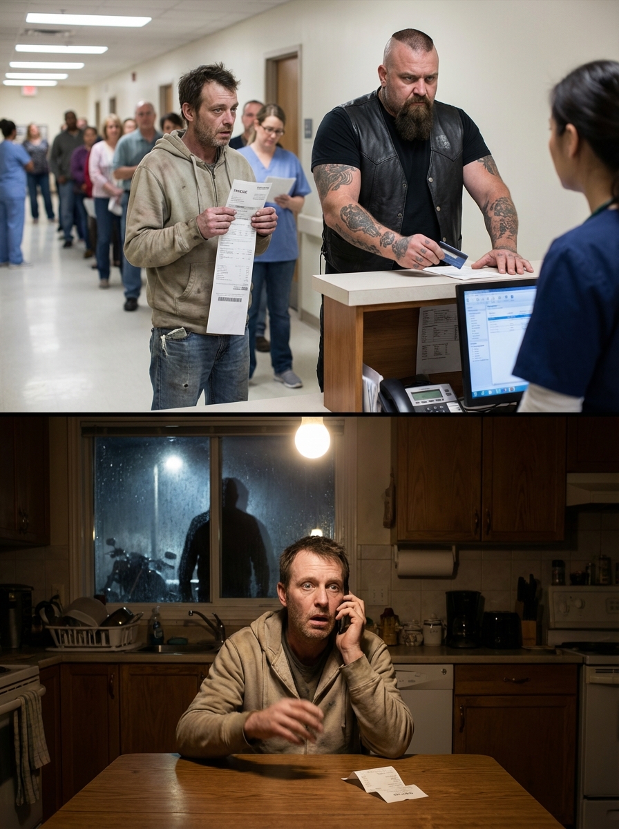 The man in the black leather vest stepped up beside me at the hospital counter, placed his hand on my son’s bill, and said, “I’ll take care of this,” before walking away—so why did it feel less like help… and more like something I should have recognized?
