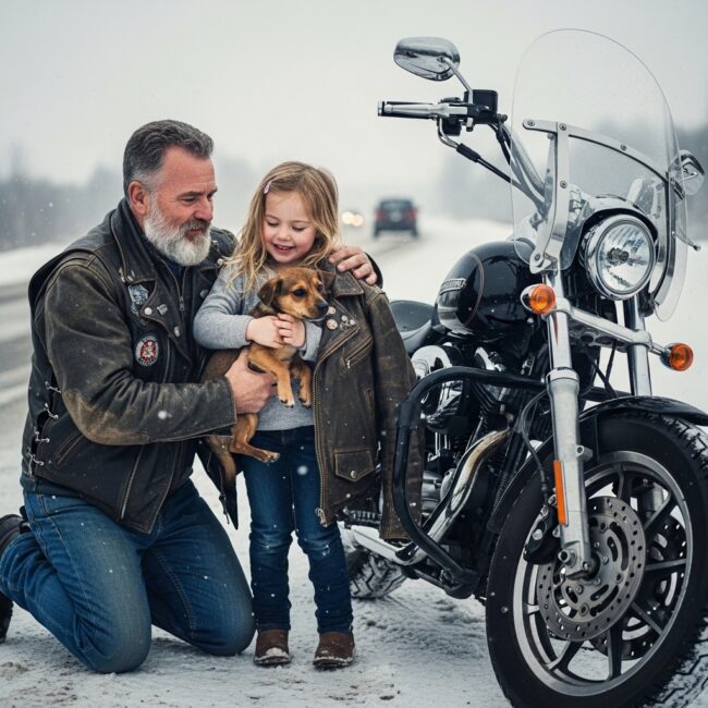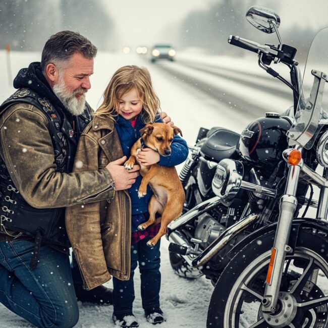 Until a bearded man in leather pulled over, switched off his Harley, and walked toward her. He took off his jacket, knelt, and wrapped it around both the girl and the dog.
