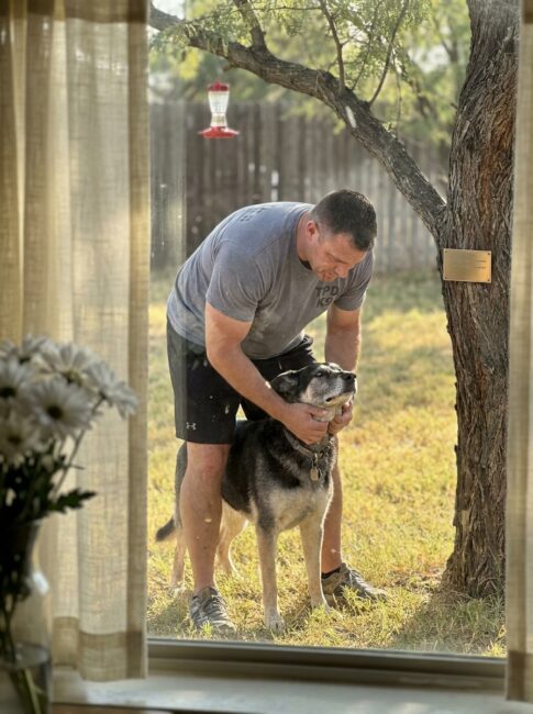 He would carry his eighty-five-pound partner across the living room, through the sliding glass door he had already opened, down the two concrete steps of his back patio, across the small back yard, and to the patch of grass under the mesquite tree where the morning sun came through the branches in a pattern of gold and shadow.