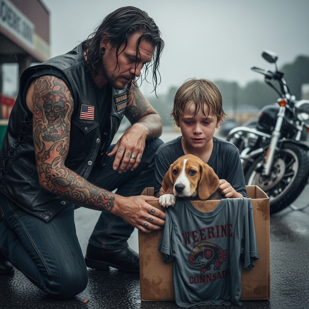He carried the box to his motorcycle, the boy running beside him. The sight turned heads — a big tattooed biker carrying a box with a puppy inside, and a soaked little boy chasing after him.