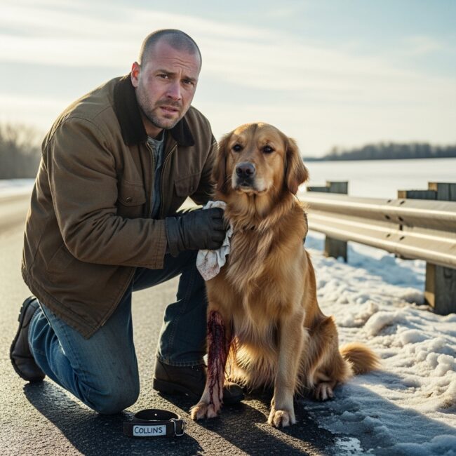 The man’s whisper hung heavy in the cold air. On the side of a deserted country road, a wounded golden retriever whimpered beside a rusted guardrail. Blood on its fur, collar half-torn.