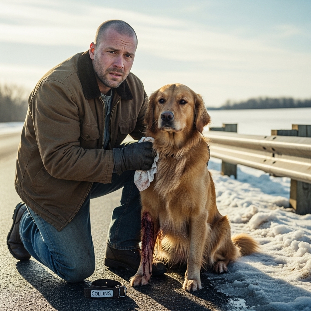 The man’s whisper hung heavy in the cold air. On the side of a deserted country road, a wounded golden retriever whimpered beside a rusted guardrail. Blood on its fur, collar half-torn.