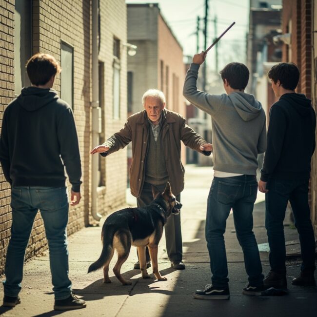 Three teenage boys had cornered a stray — a young shepherd mix with matted fur and frightened eyes. The smallest one held a metal rod. The others egged him on.