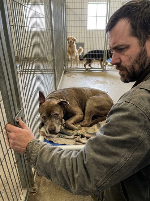 A Pitbull mix. Maybe ten years old. Faded brown coat, patches thinning around the ribs. One ear slightly folded. Eyes open—but distant.