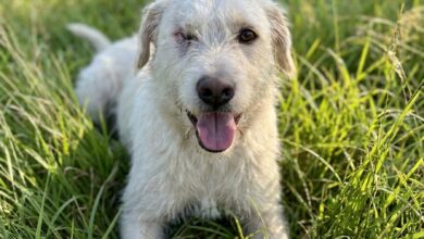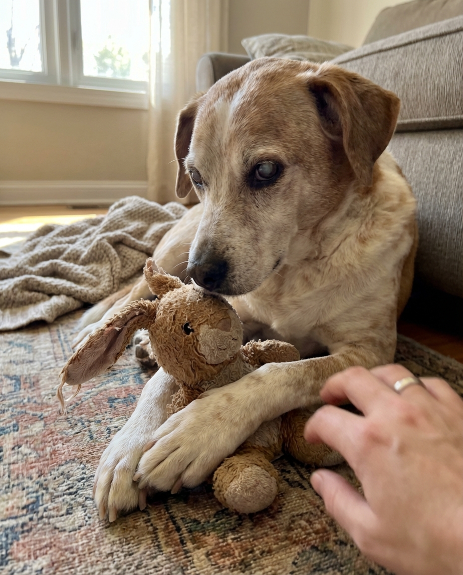 A senior mixed-breed with dull, thinning tan fur and a face that looked older than it should have been. His eyes were cloudy—not fully blind, but distant. Like he wasn’t really looking at the world anymore.