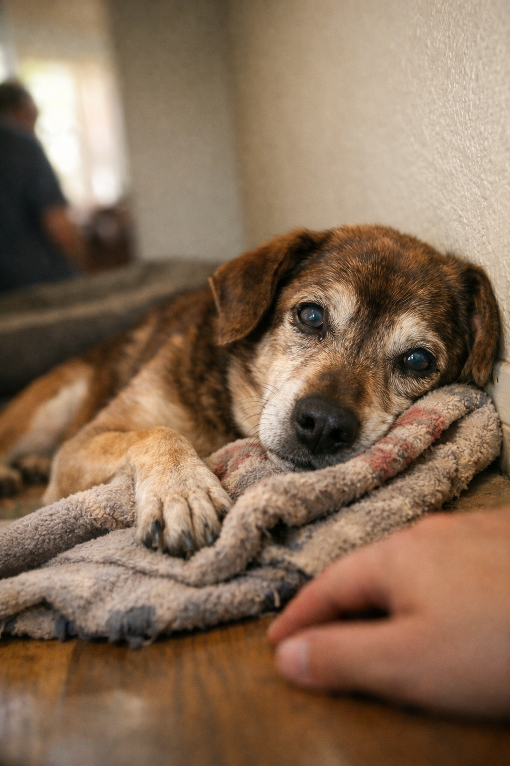 A senior mixed-breed with patchy brown fur, cloudy eyes that avoided contact, and a body that stayed curled so tightly it looked like he was trying to disappear into himself.