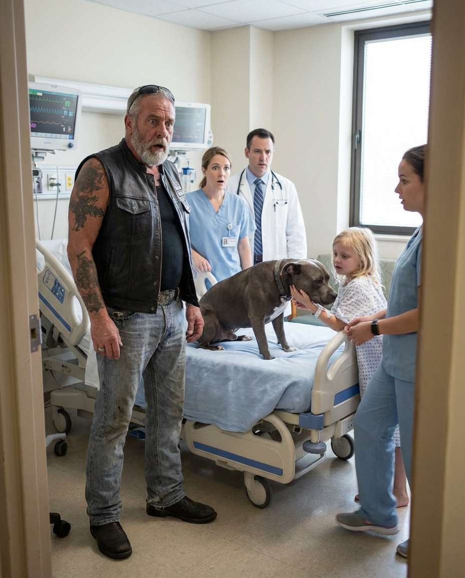 A rough-looking biker and his “aggressive” pit bull were escorted out of a county hospital… until a child inside stopped responding to everyone—except the dog.
