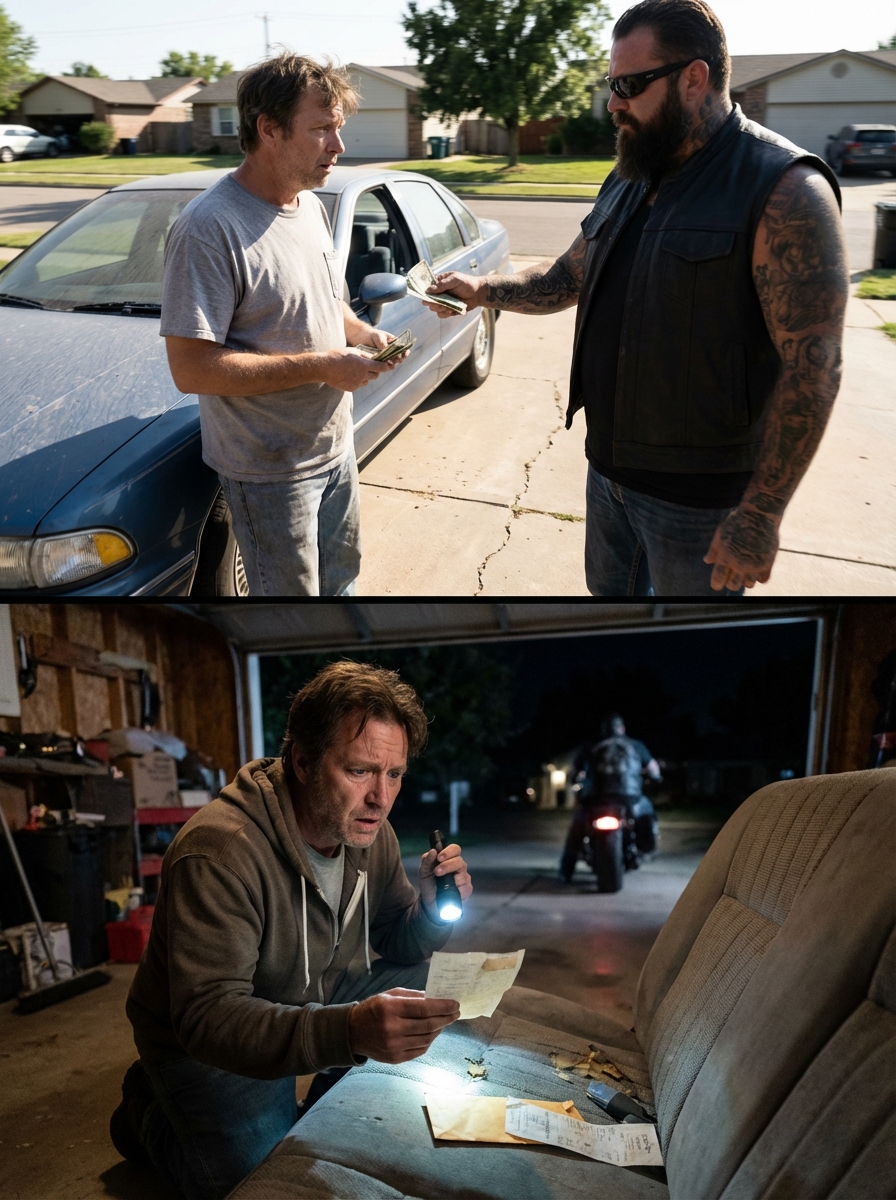 I sold my old car to a biker for cash… but he paid double without checking anything — and that night, what I found under the back seat made my chest tighten.
