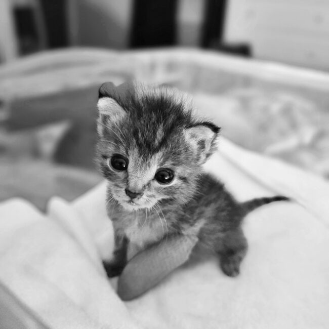 I brought him home, placed him in a warm incubator, and began round-the-clock care. Every meal was a struggle, every clean diaper a small victory. His soft cries became familiar — each meow a fragile spark of life. Slowly, he began to fight. He started eating more. Sleeping more soundly. He’d crawl into the crook of my neck every morning, purring faintly.