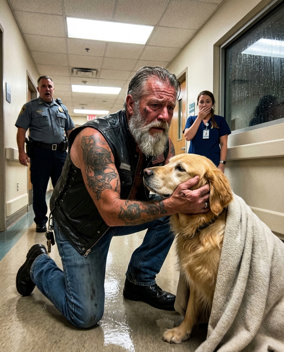 In my arms lay a Golden Retriever, maybe eight years old. Big frame, once strong. Now frighteningly light. His golden coat was matted with rain and dirt, clumped along his ribs. One paw hung at an unnatural angle. His chest fluttered in shallow, uneven spasms. I could feel every weak breath through my jacket.