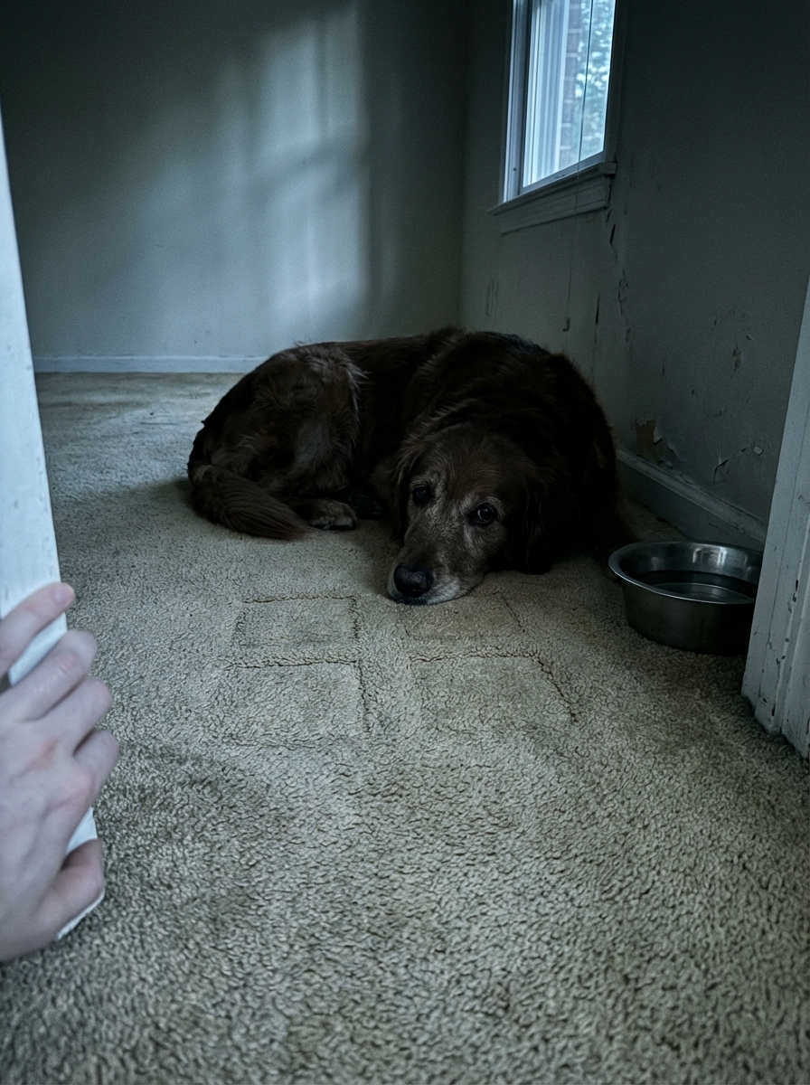 She drank water — I slid a bowl through the cracked door at night. She ate a few bites of kibble. But she wouldn’t leave that spot. Not for walks. Not for treats. Not for me.