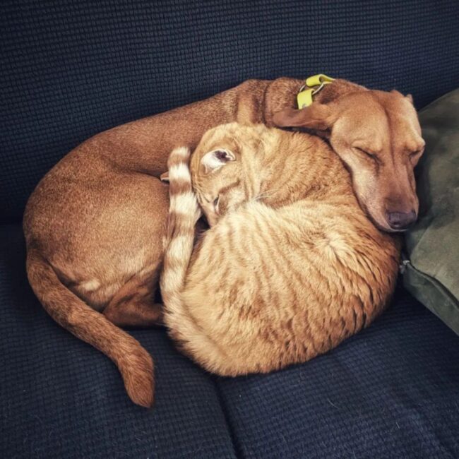 Because sometimes… love looks like a ginger tabby curling up beside a scared dog—no words, just purrs.