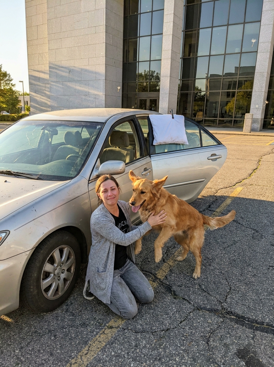 The walk to the car was the hardest part and also the easiest part. Hardest because sometimes she had applied to twenty jobs that day and heard nothing from the hundred and eighty-five she had applied to since June. Easiest because at the end of the parking lot was a Golden Retriever who thought she had just done something wonderful.