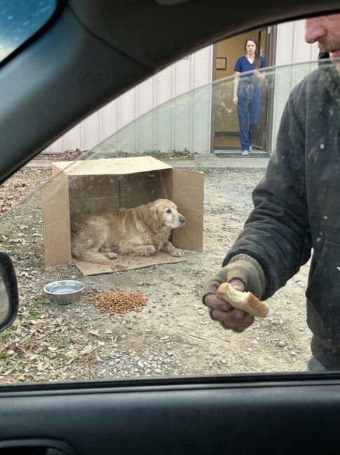 The stray dog lay curled inside a torn cardboard box behind the clinic, growling at anyone who came close—even though it was empty.