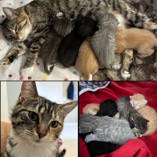 She had been carrying new life while surviving the brutal streets alone. But now, surrounded by warmth and kindness, she gave birth to five tiny kittens. One by one, their soft mews filled the room — fragile yet full of life.