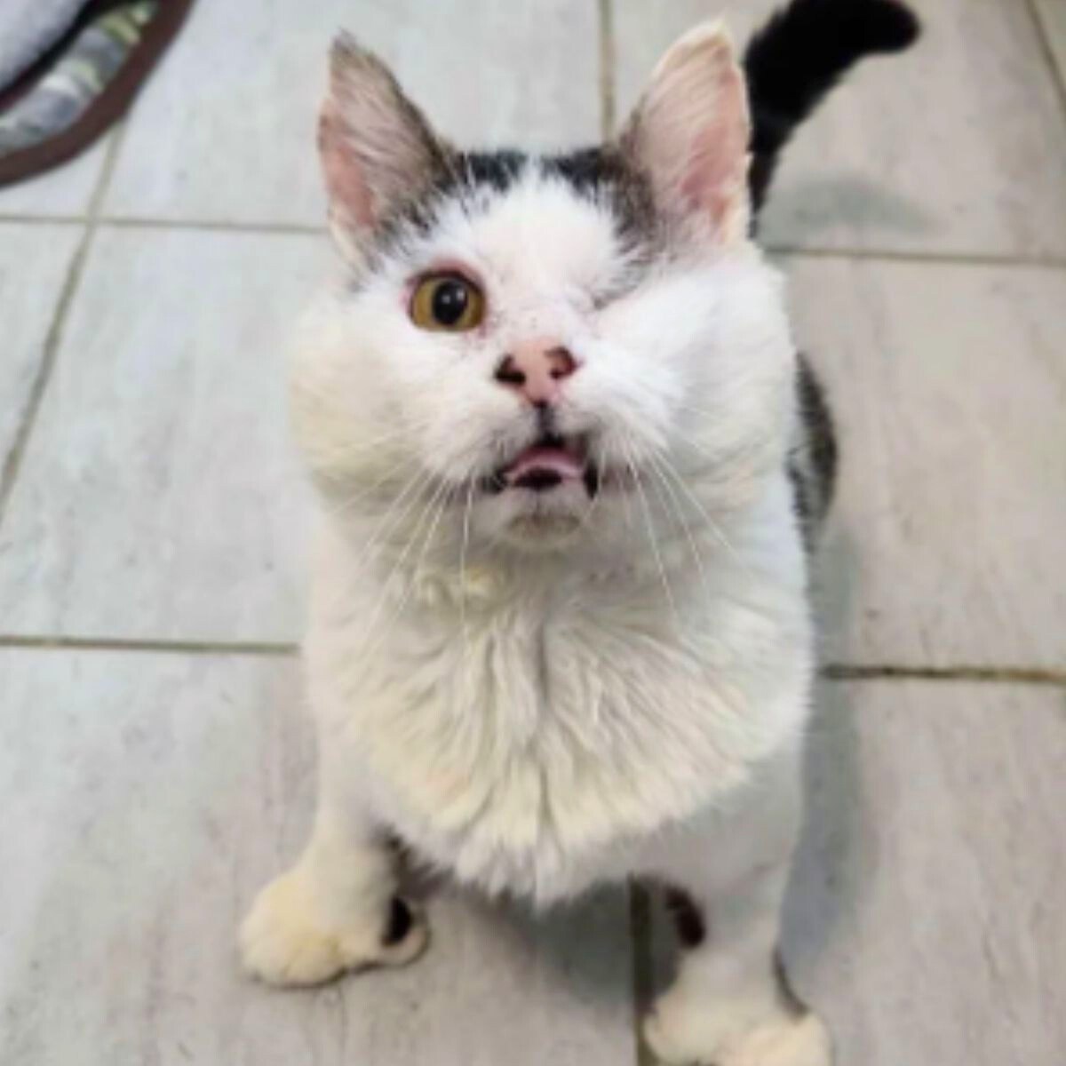 It was a gray, gloomy afternoon when a rescue team spotted the cat near an alley. Skin and bones, its fur matted and stained, it was barely standing. One eye was shut tight, swollen, and infected.