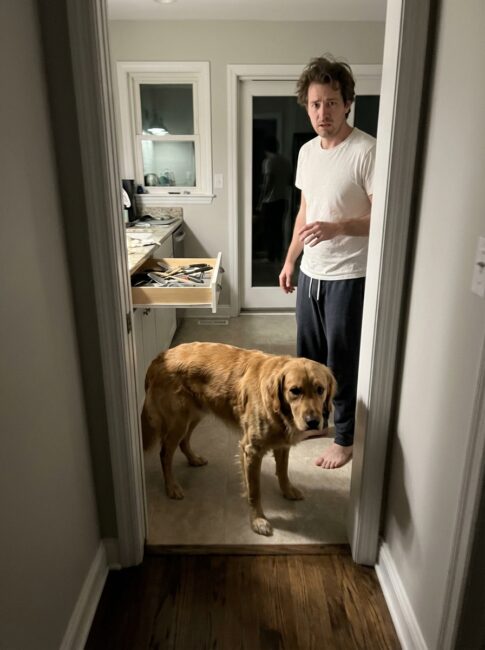 He didn’t look at me this time. His eyes were locked on the far end of the hallway—toward the kitchen. His body stiffened, muscles tight under his coat, tail low but not tucked.