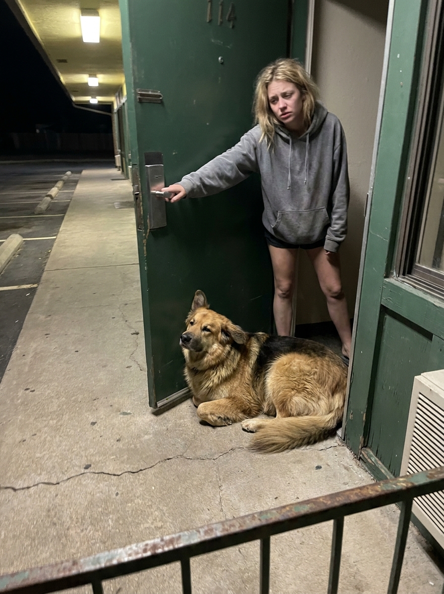 The dog in it was a mutt of some kind. Maybe shepherd, maybe retriever, maybe both. Thick golden-brown coat gone darker at the spine. Front paws crossed awkwardly over each other. One shoulder pressed against the base of the door like a wedge.