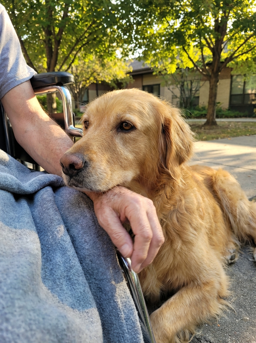 The dog lay completely still beside a man in a wheelchair for hours, refusing to move—and just as someone reached to pull it away, it let out a low sound that stopped everyone.