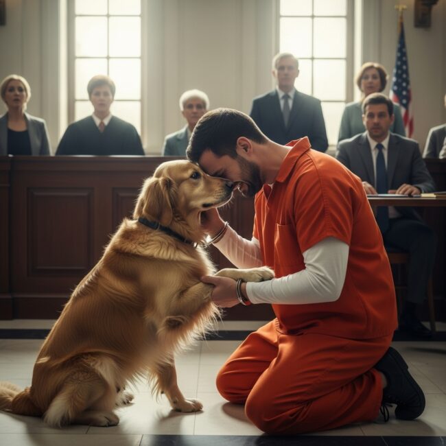 He knelt despite the handcuffs, pressing his forehead to the dog’s. The courtroom fell silent. Even the judge, watching from the doorway, looked away for a moment.