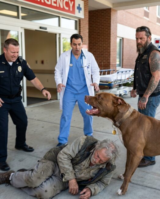 The dog stood between the old man and the hospital doors, teeth bared and barking like a threat—yet somehow, it felt like it was guarding him from everyone else.