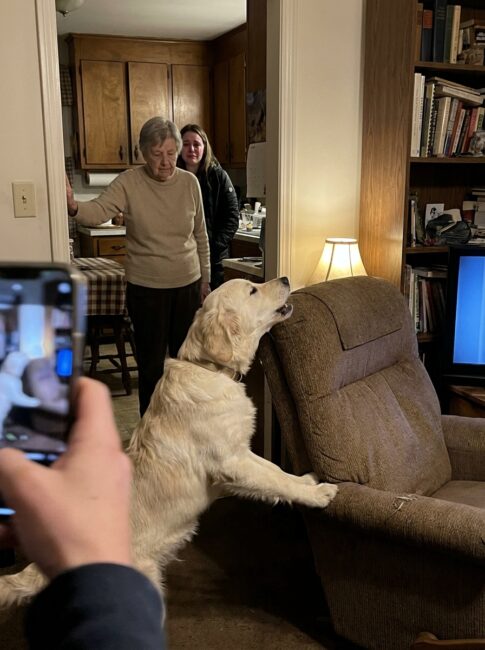 Wally, who had been chewing a ribbon under the coffee table, came out, looked at the case, looked at the chair, and rested his chin on Grandma’s knee.