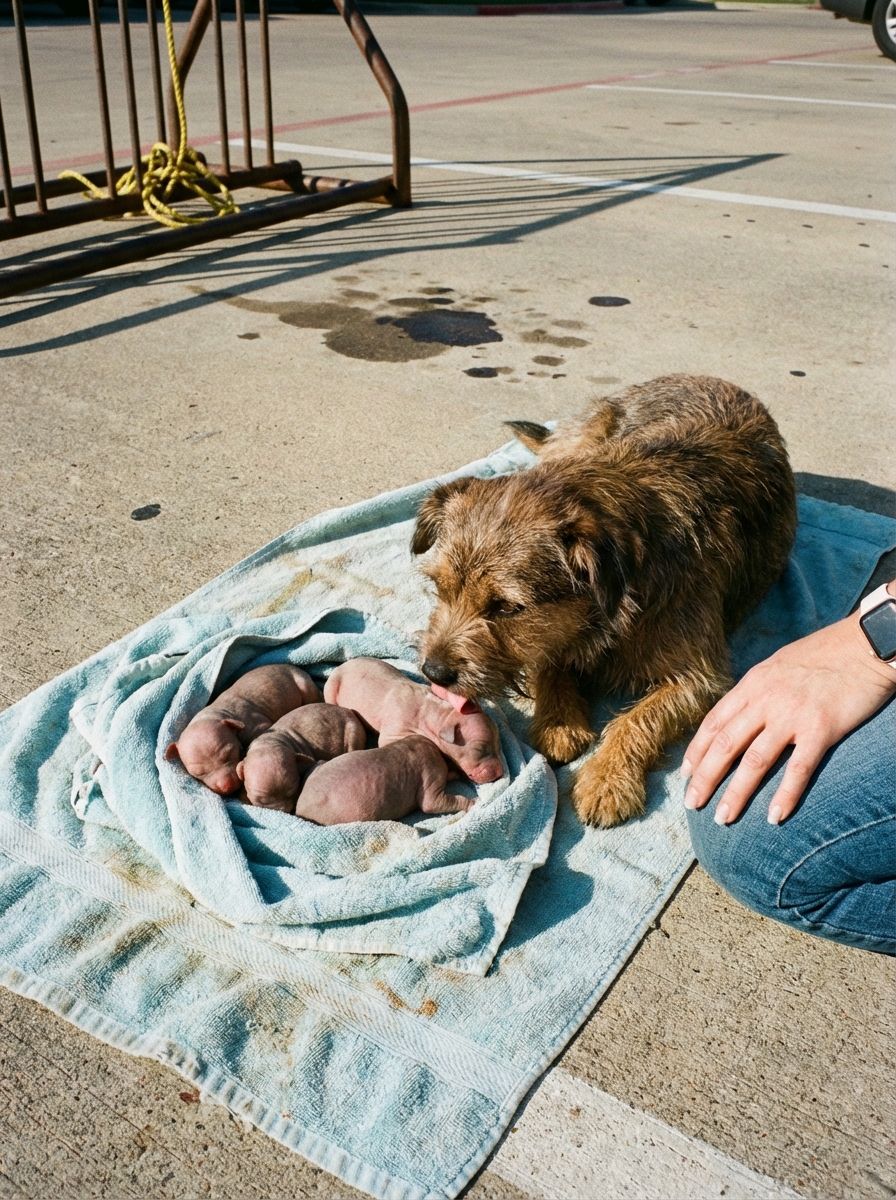 This wasn’t abandonment in the way most people imagine it — careless, impulsive, thoughtless. This was the opposite. Someone had left this dog in a visible, public place, tethered with enough slack to reach her puppies but not enough to wander into the parking lot. Someone had chosen a wall that faced east, so the morning sun would warm the concrete. Someone had folded a towel.