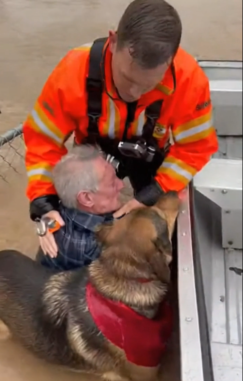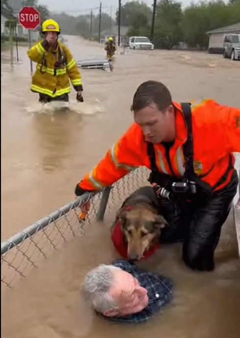 The bodycam kept recording—the man’s shaking hand buried in Rex’s soaked fur, the dog finally allowing himself to pant hard, the water still raging around them.